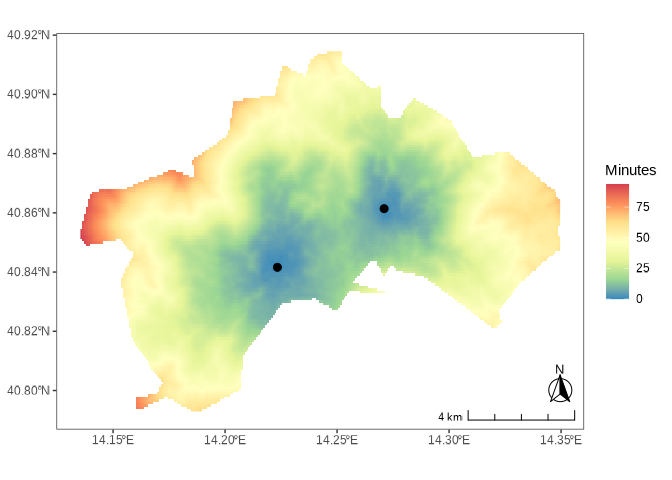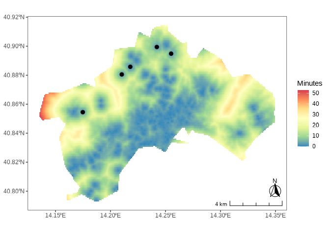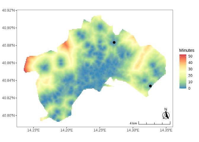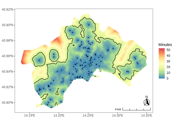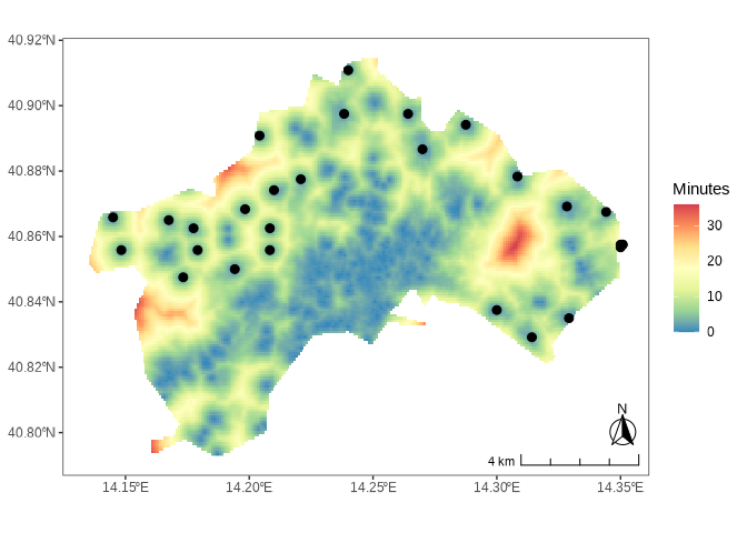 We can use the traveltime() function to create a map of current accessibility to the facility points (represented by the sf object naples_fountains) within the specified geographical boundaries. The function allows the user to select a travel mode (walking or fastest route) and an output spatial resolution in meters, achieved through dissevering spatial downscaling techniques.