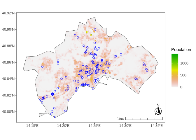 These datasets include the coordinates of public drinking water fountains (blue dots) in Naples, Italy (naples_fountains); a gridded population raster from the Global Human Settlement Layer (GHSL) Population Grid (GHS-POP) (naples_population); a 100-meter resolution heat hazard map, representing the number of days with Wet-Bulb Globe Temperature above 25°C during 2008–2017, obtained from the UrbClim model (naples_hot_days); and the city’s administrative boundaries (naples_shape).