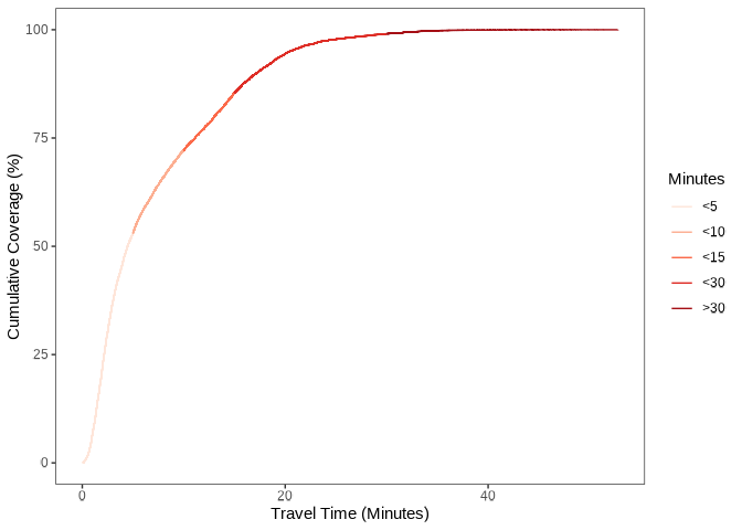 We can also generate a summary plot and compute statistics using the output of the traveltime() function, together with a demand raster (e.g., population density) and a specified time threshold, using the traveltime_stats function: